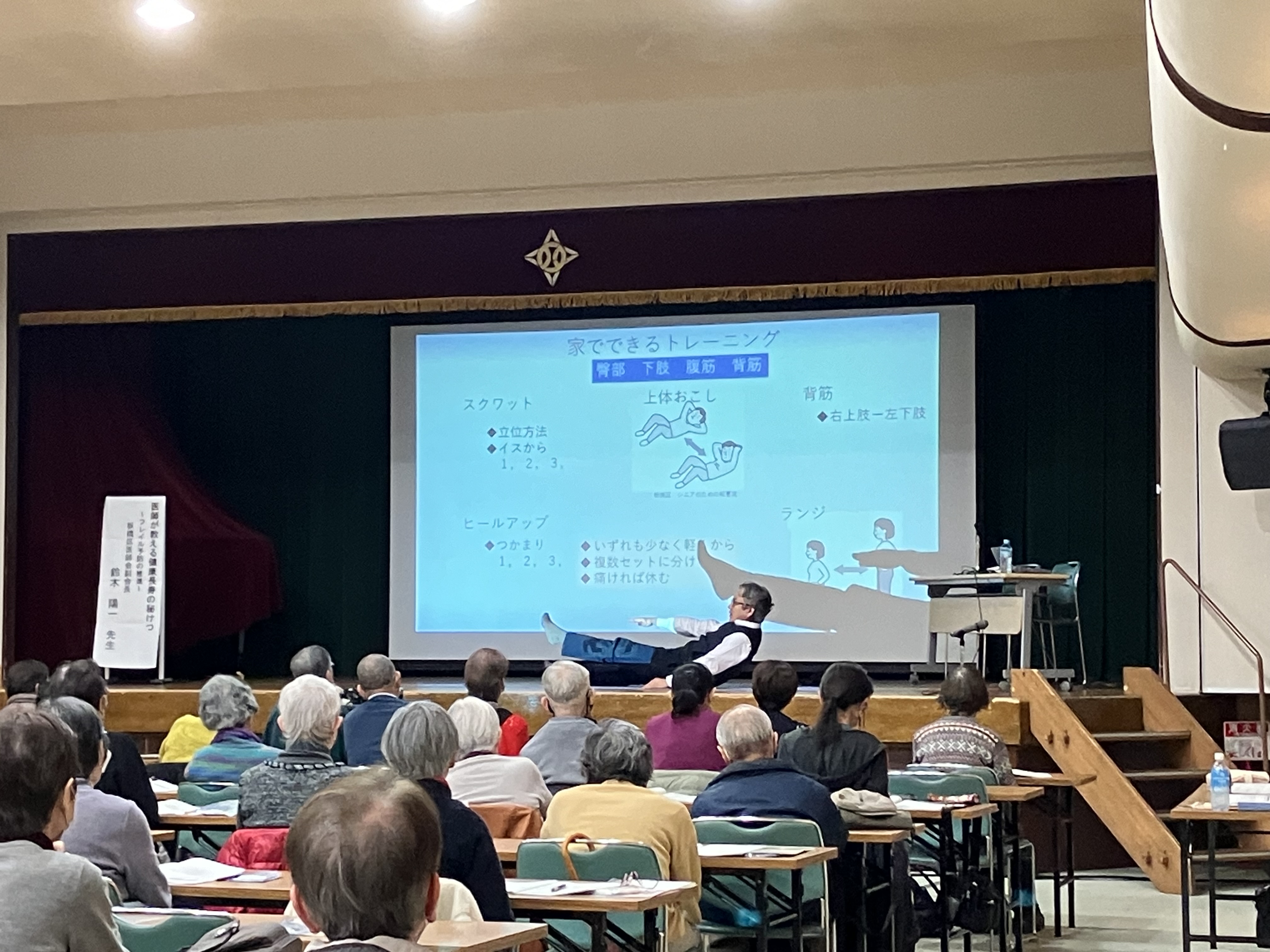講演の途中、自宅でできる運動を参加者と一緒に行い、和やかに終了しました。(講演者 鈴木陽一)